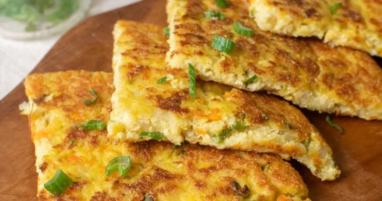 Beetroot chickpea fritters on a plate with whipped feta dip, top view.